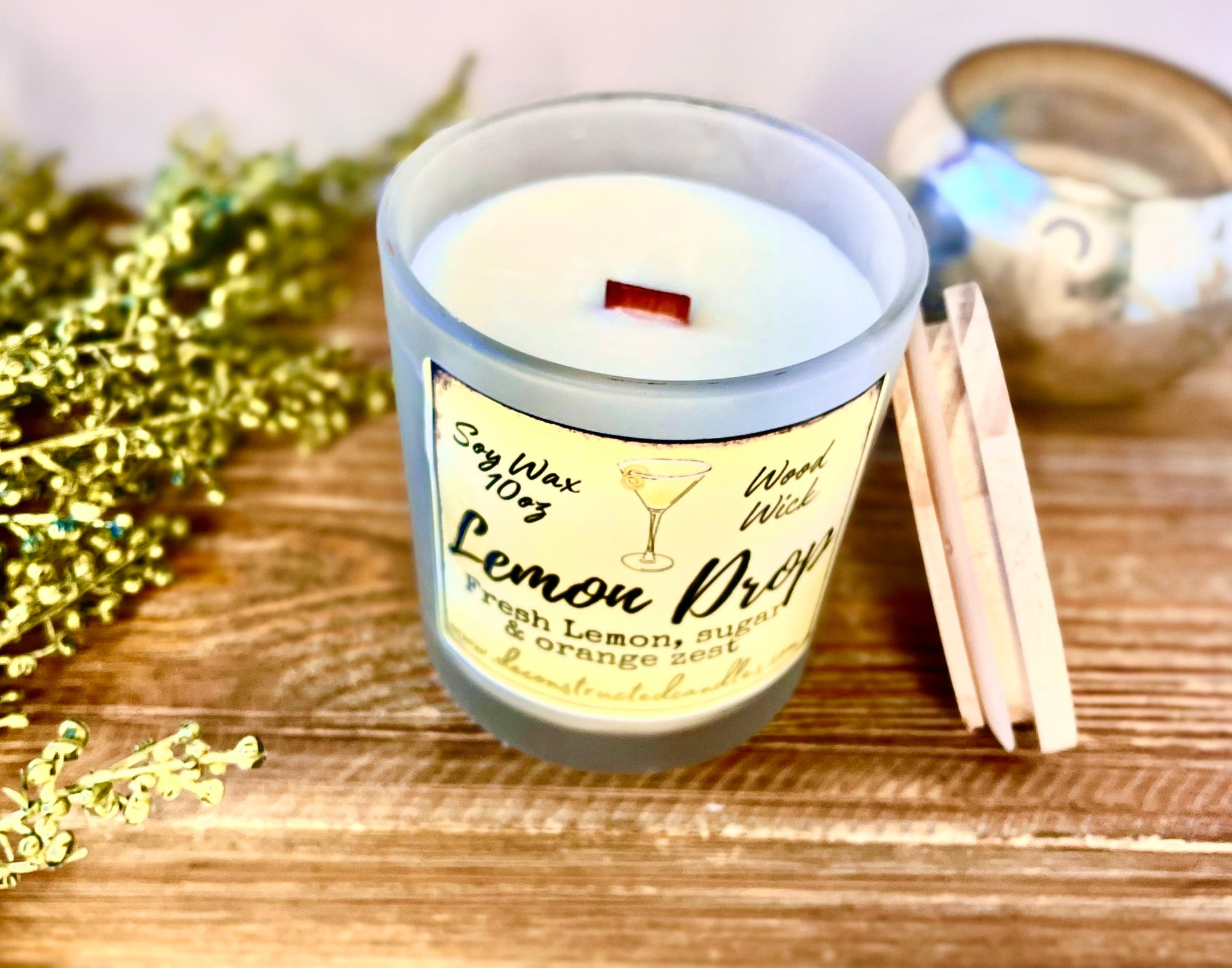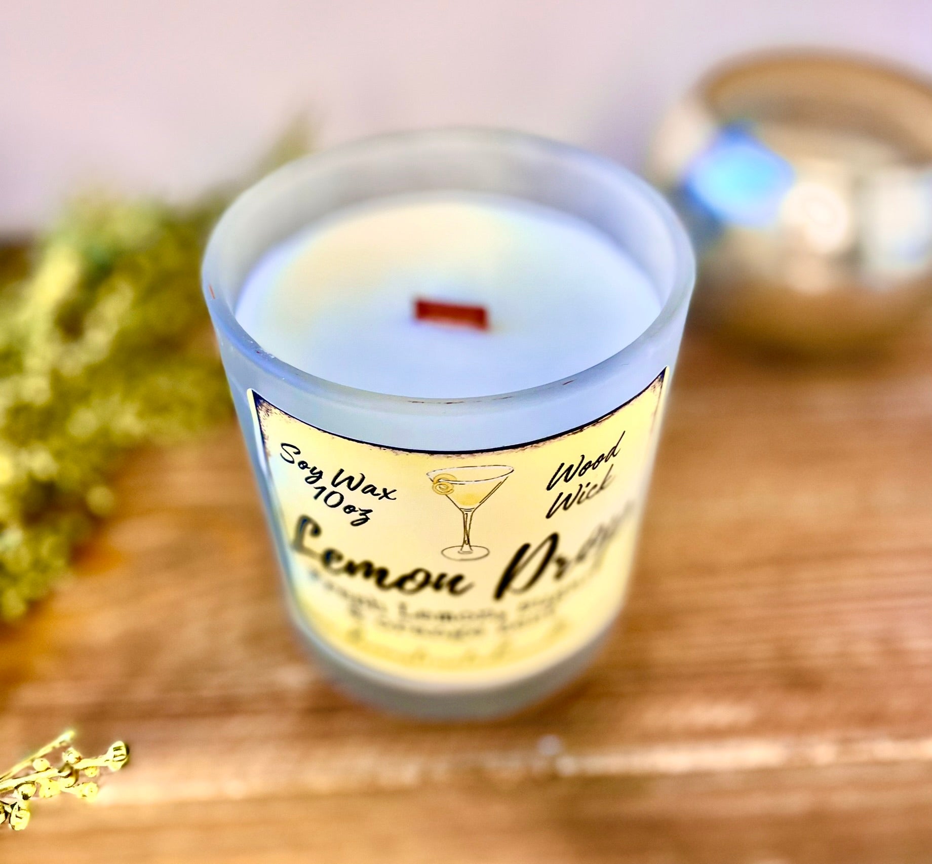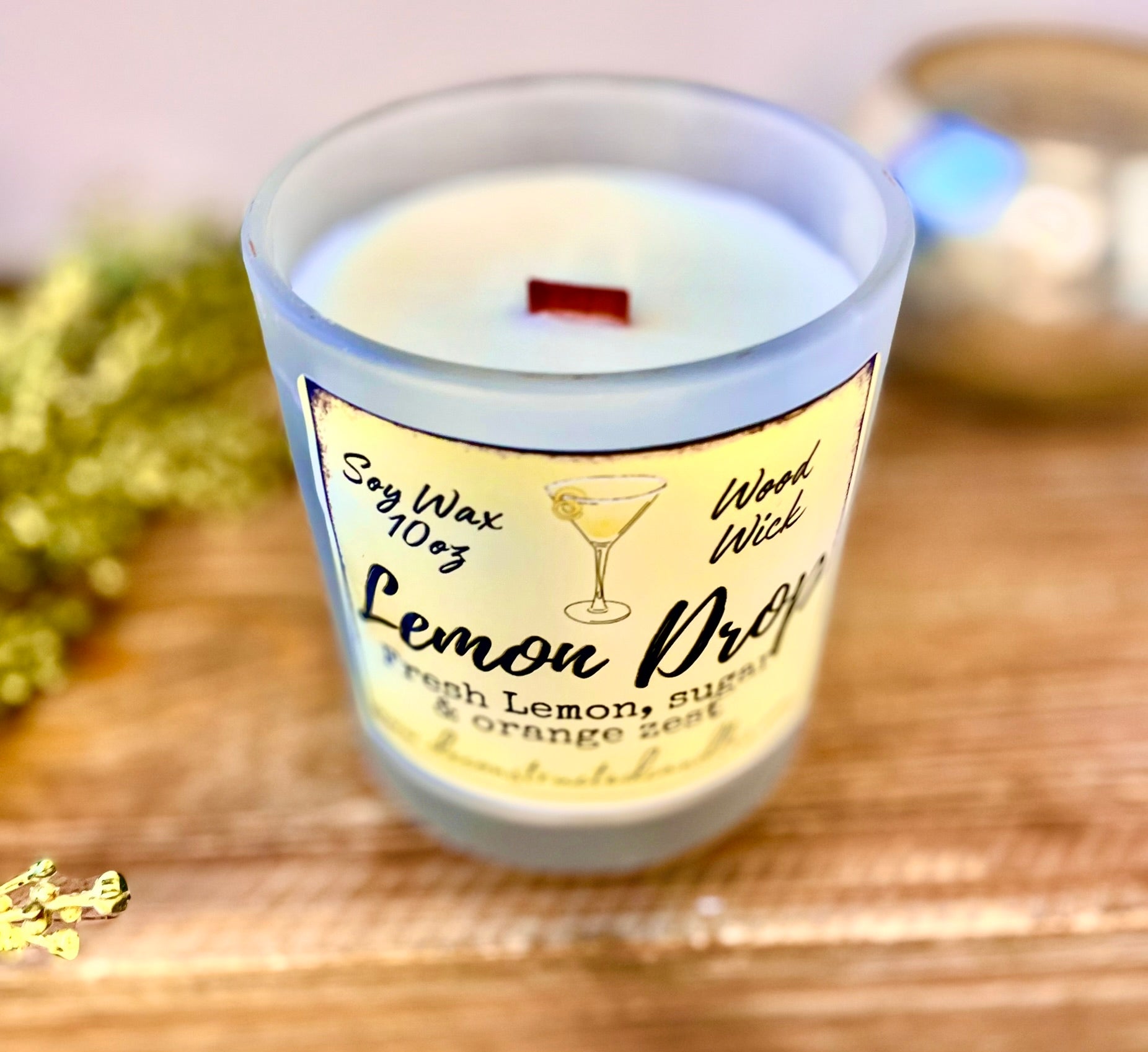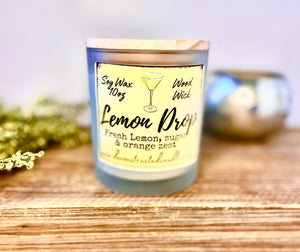 10oz SOY Candle - Lemon Drop Martini Scent - Wood Wick - clear frosted glass with wood lid